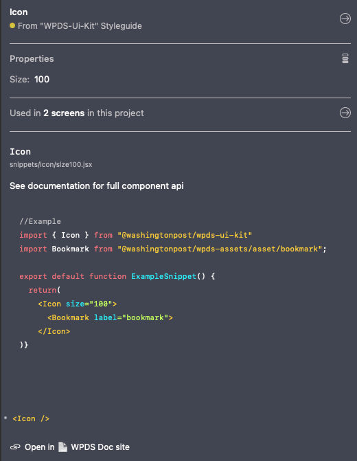 By linking the style guide you unlock our connected compoents. Selecting a component connected to code in Zeplin will reveal a code snippet and the props chosen for the component variant. This happens when you use our Figma Ui Kit components!